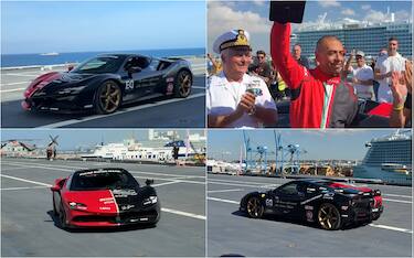Al volante di una Ferrari SF90 Stradale da 1.000 cv e sul ponte di lancio della Nave Trieste,...