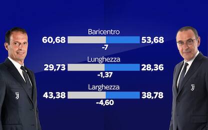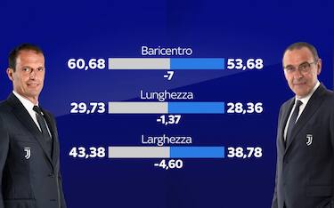 Sarri-Allegri, Juve attuale gioca più bassa di 7 m Serie A Durante Sky Calcio Club sono stati messi a confronto i dati su baricentro, lunghezza e larghezza... 16 set - 10:31