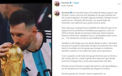 Messi: "Questa coppa è anche di Maradona" sui social Il fuoriclasse argentino ha pubblicato su Instagram un video che ripercorre la sua carriera e... 20 dic - 16:49