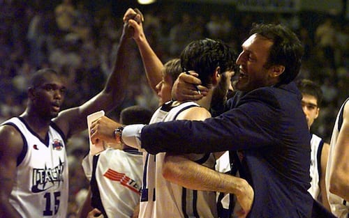 - In foto, l'abbraccio tra Dino Meneghin, team manager, e suo figlio Andrea, giocatore, dopo la vittoria 61-60 contro la Jugoslavia nella seconda fase. La Jugoslavia avrebbe poi vinto quel Mondiale in finale sulla Russia