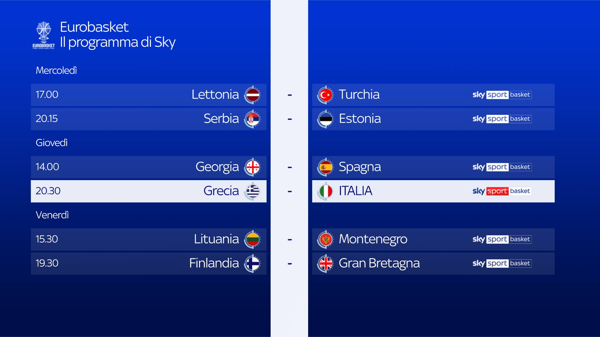 La Nazionale Azzurra giocherà i match della prima fase alla Spyros Kyprianou Arena di Limassol (Cipro), a partire da domani 28 agosto alle 20.30 contro la Grecia. Per la prima fase a gironi, Sky Sport trasmetterà live due-tre partite al giorno, affiancate da uno studio quotidiano alle 12.45 su Sky Sport 24 e da una seconda finestra attorno alle 18.00, che verrà definita giorno per giorno. L'avventura degli azzurri è seguita sul posto da Flavio Tranquillo e Davide Pessina, che si occuperanno del commento live delle partite, con il contributo di Gaia Accoto per le interviste ai protagonisti. Dagli studi Sky di Milano, invece, le telecronache saranno affidate alle voci di Geri De Rosa e Andrea Solaini, con la presenza sia per gli studi che per i commenti live di Andrea Meneghin, Matteo Soragna e Laura Macchi, mentre la conduzione degli studi è affidata a Francesco Bonfardeci, che guiderà lo spazio di approfondimento pre e post-partita in occasione di ogni gara degli azzurri.
