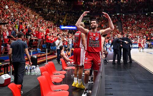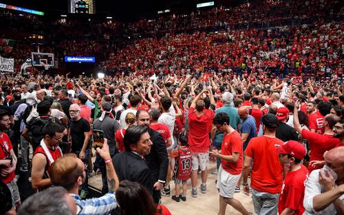 Milano torna a conquistare il titolo dopo quattro anni: 81-64 il punteggio finale in gara-6 e al termine del match al Forum di Assago scatta la festa di giocatori e tifosi che invadono il parquet. Ecco le immagini più belle della festa dell'Olimpia