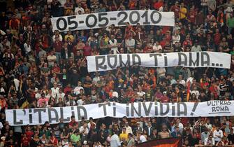 L'ultima giornata sarà decisiva per l'assegnazione del titolo e tra giallorossi e nerazzurri è sfida anche a colpi di striscioni. Mentre la Curva Sud si schiera con il suo capitano dopo le polemiche seguite al calcione rifilato Balotelli, a San Siro il pubblico è tutto per il suo condottiero José Mourinho. GUARDA LA FOTOGALLERY