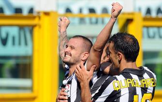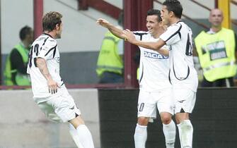 Pinzi e Di Natale lo aspettano a braccia aperte. Floro Flores corre verso i due compagni di squadra dopo aver segnato il gol dell'1-1 contro l'Inter (foto Ansa)