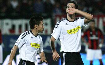 CESENA-MILAN 2-0. Erjon Bogdani saluta la curva con Juto Nagamoto dopo aver segnato la rete del vantaggio del Cesena sul Milan (foto Ansa)