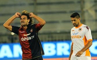 Acquafresca? No, gelida. Come quella che l'attaccante del Cagliari getta sulla Roma con il suo gol che è valso il 3-1 (foto Ansa)
