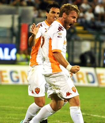 La rabbia di Daniele De Rossi, festeggiato da Nicolas Burdisso, autore del pari momentaneo della Roma (foto Getty)