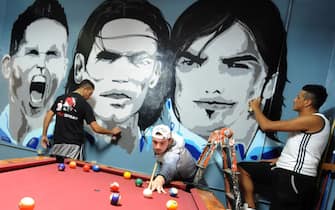 La passione di un gruppo di tifosi ha portato alla creazione in una sala giochi di un gigantesco graffiti raffigurante le tre stelle della squadra partenopea: Hamsik, Cavani e Lavezzi (foto Ansa)