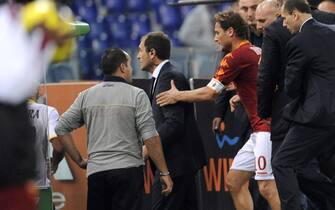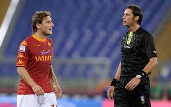 Francesco Totti chiede spiegazioni ma l'arbitro non ne vuole sapere e gli indica di andare sotto la doccia