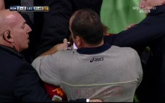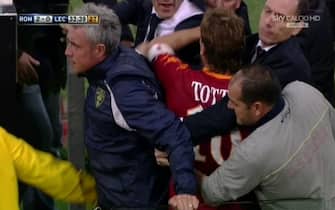Francesco Totti ha rimediato un'espulsione nel match contro il Lecce che lo costringerà a saltare il derby. Colto da una crisi di nervi è stato trattenuto da ben sei persone