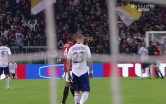 In fondo l'immagine di Totti che, una volta in piedi, spintona Olivera sotto gli occhi dell'arbitro