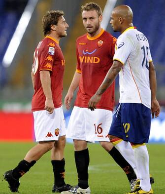 Il capitano della Roma ha rimediato un cartellino rosso nel match contro il Lecce per una reazione nei confronti di Olivera e salterà il derby. Dopo essere stato espulso, colto da un attacco isterico, Totti è stato trattenuto e calmato da sei persone. GUARDA LE FOTO