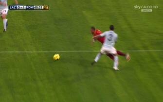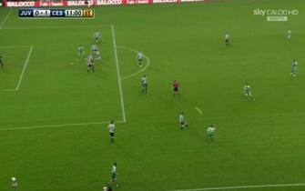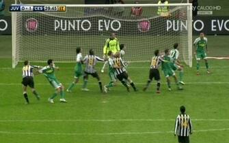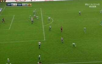 Pellegrino marca Bonucci che gli passa alle spalle. Pellegrino allunga il braccio e lo tiene per la maglia fino a farlo cadere. Rigore netto in un’azione che era ancora lontana dal diventare pericolosa