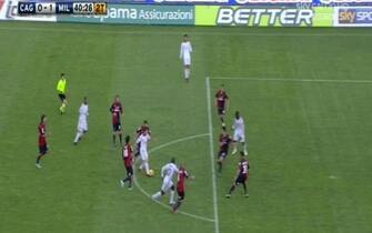 CAGLIARI-MILAN 0-1. Sul gol del Milan Cassano s'infila in mezzo alla difesa del Cagliari poi tocca per Strasser. Il ragazzo milanista è appena avanti alla difesa del Cagliari