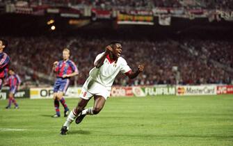 18 maggio 1994: Marcel Desailly festeggia la rete nella finale di Champions League contro il Barcellona allo stadio Olimpico di Atene. Il Milan vinse 4-0