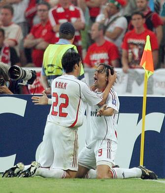 Atene, 2007, stadio Olimpico: Kakà e Inzaghi esultano nell'ultima Champions vinta dai rossoneri, contro il Liverpool