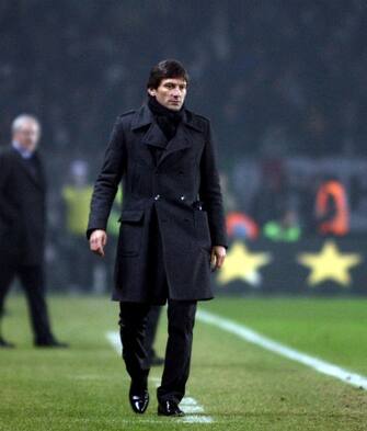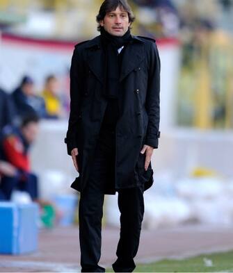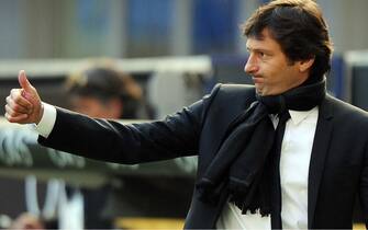 Leonardo con il tipico look sfoggiato sulla panchina rossonera: trench, camicia bianca e cravatta