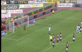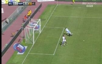 BOLOGNA-NAPOLI 0-2. Rigore netto quello del Napoli. Lavezzi salta Viviano che lo stende. Da valutare la posizione di Hamsik sul lancio inziale, ma la moviola mostra un’azione regolare