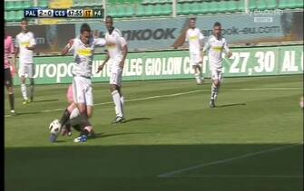 PALERMO-CESENA 2-2. Grande slalom di Jimenez a fine primo tempo, con il Palermo in vantaggio. Viene affrontato in tackle da Goian dentro l’area. Jimenez finisce a terra e protesta molto, Goian ha però colpito la palla. Si vede chiaramente dalla deviazione