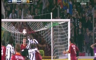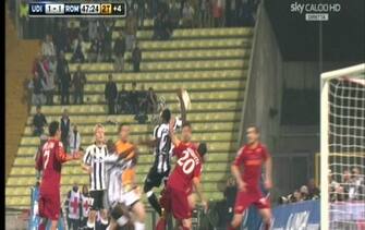 UDINESE-ROMA 1-2. Al 47’ del secondo tempo, sul pareggio, l’ Udinese segna ma il gol viene annullato per un fallo di mano evidente di Asamoah