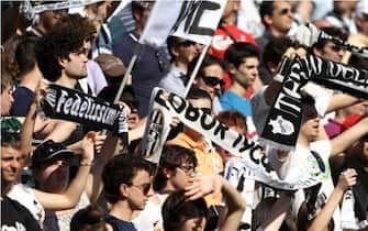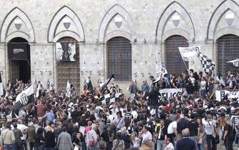 I tifosi senesi si sono subito riversati in Piazza del Campo per festeggiare la promozione (Ansa)