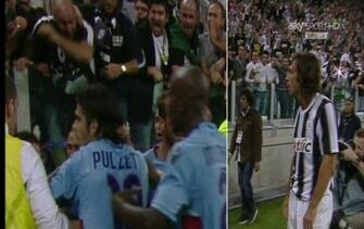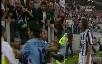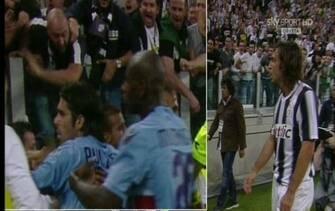 Un supporter bianconero, mentre è in corso una rissa in campo tra i giocatori, si sporge dalla balaustra e allunga le mani contro Marco Di Vaio. Per lui potrebbe scattare la prova Tv. Rischia 5 anni di Daspo. LE FOTO
