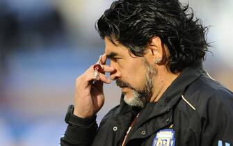 Una delle immagini del Mondiale sudafricano del 2010 è questa: Diego Armando Maradona, allenatore dell'Argentina, che segue le partite della sua squadra con una coroncina ben stretta tra le dita