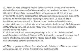 Il comunicato ufficiale del Milan sul malore di Cassano