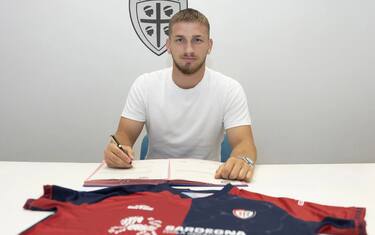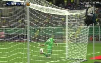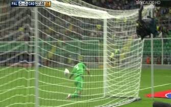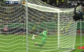Il portiere del Cagliari respinge una punizione del numero 10 rosanero, destinata in rete, in maniera alquanto singolare...