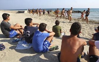 Sulla fantastica spiaggia di Ostuni, siesta dei ragazzini che si godono lo spettacolo del Parma di corsa -