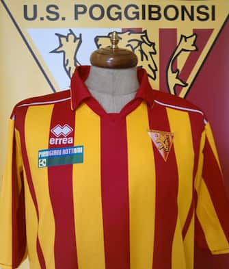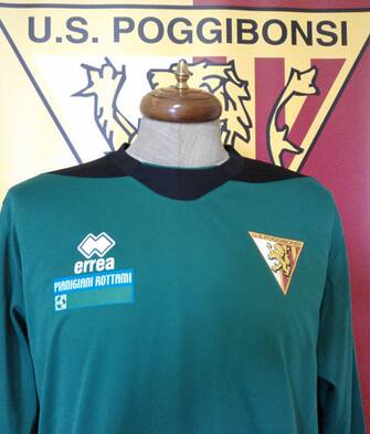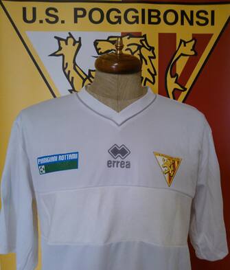 La prima maglia del Poggibonsi: classiche righe verticali giallorosse. Come sponsor, l'azienda del presidente: "Pianigiani Rottami" -