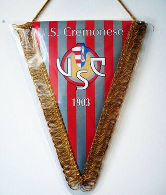 Il gagliardetto della Cremonese: il simbolo è quello della città, cioè il Torrazzo di Cremona, il campanile più alto d’Italia. Nello stemma sono raffigurati anche i colori sociali, il rosso e il grigio -