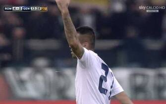 LA FOTOGALLERY. Strana disavventura per il brasilano nel corso di Roma-Genoa. L'ex laziale risponde con un gesto ai tifosi giallorossi mentre sta lasciando il campo per essere sostituito da Cofie. Calvarese lo vede: secondo giallo ed espulsione
