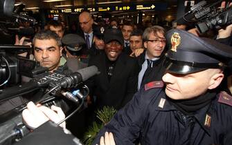 La troupe di Sky Sport 24 all’inseguimento di Clarence Seedorf, poco dopo lo sbarco a Linate -