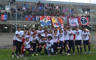 Il Campobasso in Serie D. La squadra festeggia sotto la "Curva Scorrano" dello stadio Romagnoli la promozione ottenuta con il successo nella semifinale della Coppa Italia Dilettanti (foto dalla pagina FB "Campobasso nel cuore") -