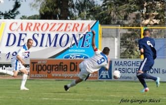 L'attacco dell'Aprilia è guidato da Antonio Montella (qui in gol contro il Castel Rigone): punta napoletana, classe '86, con un passato nel Messina di Serie A -