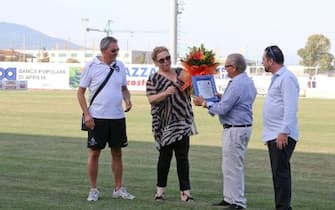 La Presidente del Latina, Paola Cavicchi, omaggiata dal numero uno apriliano, Umberto Lazzarini, prima di un'amichevole tra le due squadre. Latina e Aprilia sono molto legate: i rapporti tra le due società sono buoni e le tifoserie sono gemellate -