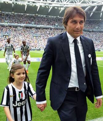 Il tecnico bianconero tiene per mano la figlia, anche lei sorridente per i trionfi del papà -