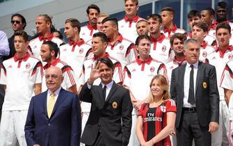 Foto di gruppo rossonera: Galliani, Inzaghi, Barbara, Tassotti e alle loro spalle la squadra -