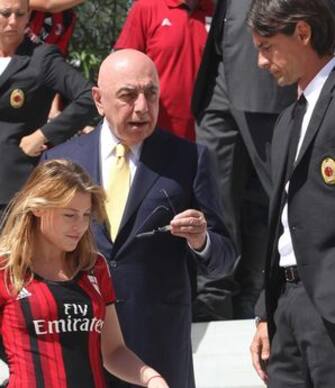 Nel piazzale, il nuovo tecnico Filippo Inzaghi ha affiancato gli amministratori delegati Adriano Galliani e Barbara Berlusconi, che indossa la prima maglia della squadra -