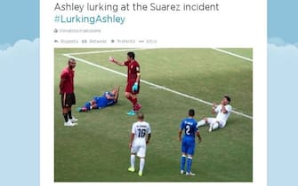 Ashley Cole mentre osserva da vicino il morso di Suarez a Chiellini: una delle prese in giro del terzino che stanno spopolando sul web -