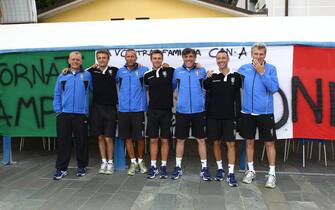 Rizzoli e gli assistenti Faverani e Stefani erano stati accolti nel centro di Sportilia con uno striscione che li ringraziava per la grande prestazione nella finale Mondiale (foto Marco Massetti) -