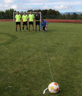 Ed ecco la "procedura" a cui ci abitueremo presto anche in Serie A: prima si segnala il punto da cui verrà calciata la punizione (foto Marco Massetti) -