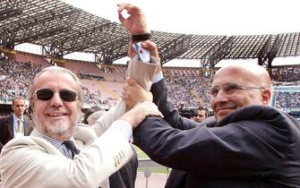 26 settembre 2004: De Laurentiis e il dg Pier Paolo Marino ricevono l’applauso del pubblico del San Paolo al loro ingresso in campo. E’ il “battesimo” del Napoli Soccer nel campionato di C1 contro il Cittadella -