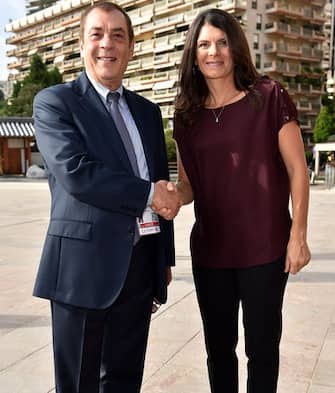 Stretta di mano tra Mia Hamm e Antonio Caliendo, proprietario e presidente del Modena a Montecarlo. La Hamm ha vissuto anche a Firenze -