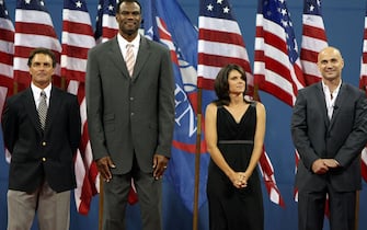 L'ex giocatore di football americano Doug Flutie, la bandiera dei San Antonio Spurs, David Robinson, Mia Hamm e Andre Agassi durante la cerimonia di apertura dell'US Open nel 2009 -