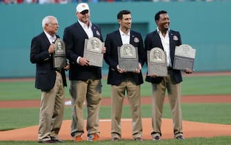 Joe Castiglione, Roger Clemens, Nomar Garciaparra e Pedro Martinez festeggiano nel 2014 l'ingresso nella Red Sox Hall of Fame -