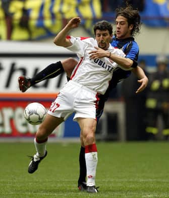 Chi è il calciatore in maglia nerazzurra che prova a contrastare Dario Hubner? -