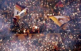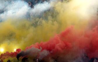 Sempre spettacolare il gioco di fumogeni della Sud, un marchio di fabbrica della curva giallorossa -