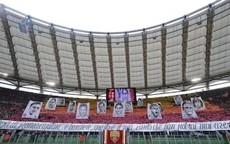 Questa la coreografia della Curva Sud romanista prima del derby. I tifosi hanno esposto gigantografie dei capitani nati nella Capitale -